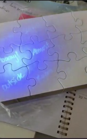 - Secret messages revealed using black light Ink pens and Puzzles Pieces or just paper