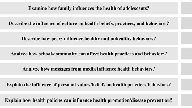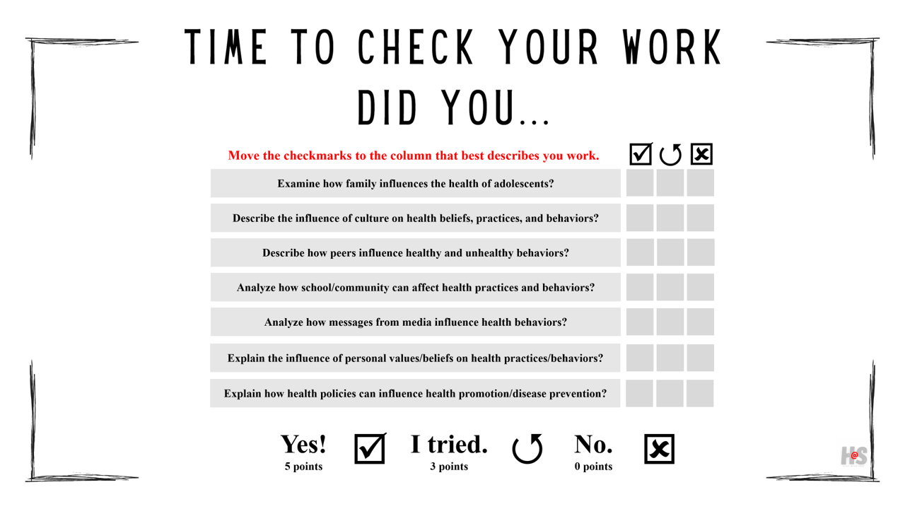 Look at this example from my middle school analyzing influences lesson. I took the performance indicators from National Health Education Standard # 2 and created a simple checklist.