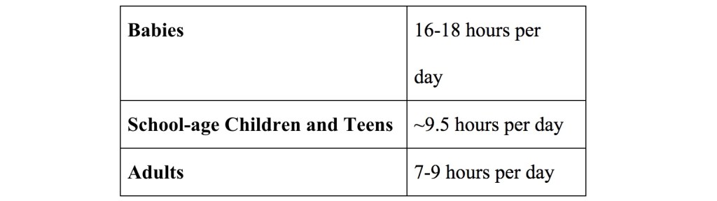Sleep hygiene recommendations include setting consistent sleep and wakeup times, allowing for the recommended hours of sleep per night, establishing a nighttime routine that does not include looking at a screen, and modifying the environment to reduce light. The table below displays adequate sleep recommendations for individuals by age.