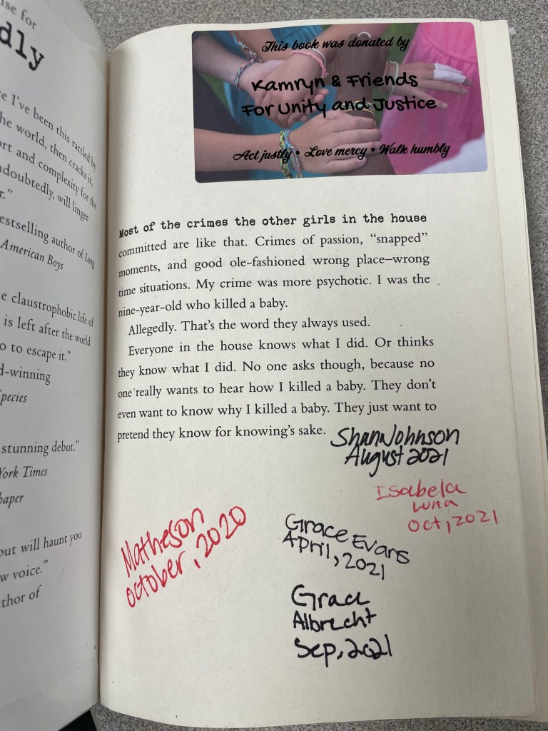 One of my most favorite things about my bookshare program is that I have students sign the inside cover of my books once they’ve read it. If my students would stop stealing The Way I Used to Be by Amber Smith, the amount of signatures in that book would be at least 15-20. (Yes, this is one of my favorites and I struggle to get it returned. I swear I’m on my 5th copy of her book and it’s also currently missing.)