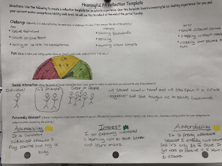 After teaching the concept and students created their templates, I took them ice skating during a Health class period. I chose ice skating because there are several free rinks around our area with low rental prices. There is also a wide range of ability level possibilities at our rink with rails and skate helpers. Within the template, students were asked to consider these possibilities under personal relevance.