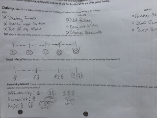 After teaching the concept and students created their templates, I took them ice skating during a Health class period. I chose ice skating because there are several free rinks around our area with low rental prices. There is also a wide range of ability level possibilities at our rink with rails and skate helpers. Within the template, students were asked to consider these possibilities under personal relevance.