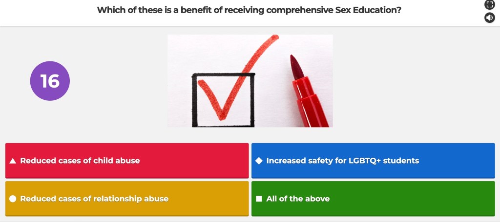 I start my sophomore sexuality education unit slowly by setting the scene for a productive quarter. I’m lucky that I have my students for a semester, so by the time we start having conversations about reproduction, contraception, STI’s etc I’ve built relationships, created a good classroom environment, and (think I) know how mature the class will be. The questions in the Kahoot allow me to address some myths, but also foreshadow many of our conversations and introduce some key messages in a lighthearted way.