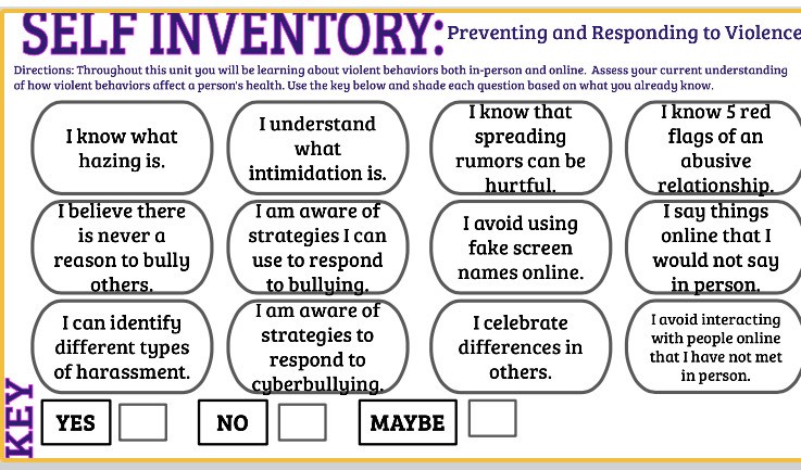 I still give a “pretest” before diving into the fascinating topics we discuss in middle school and high school health. However, I now call them self inventories and have been designing some new templates to make this activity more engaging for students. For the past few years I have used a simple digital template that students could drag a checkmark to indicate what they know or already do related to the topic. More recently I have been staying away from digital work and trying to incorporate more paper and pencil worksheets. My new and improved self inventory template can be used digitally or via hard copy. The hard copy version is my personal favorite and requires colors; colored pencils, crayons, or markers will do.