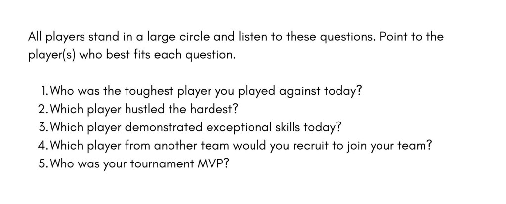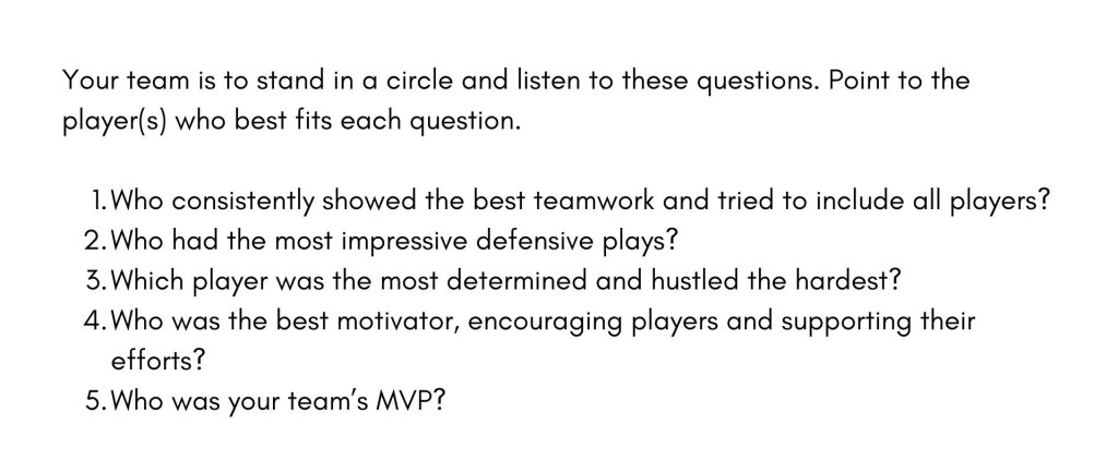 Each team was sent on a ‘walk and talk’ of two laps of the track, with instructions to introduce themselves to each other, play ‘two truths and a lie,’ and follow up with questions to get to know their teammates. We finished that first lesson with some small-sided games. While I set up the playing area, teams selected a captain. The four captains’ first task was to agree upon a shared set of rules and report those back to their team.