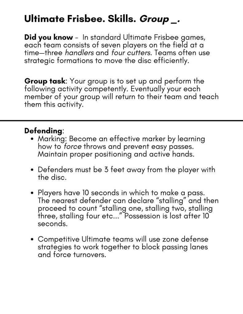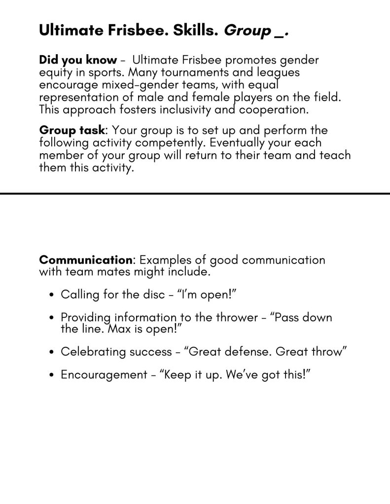 For our next lesson, I used the cooperative learning strategy of jigsaw learning. This student-centered method of teaching and learning allows students to collaborate with and teach each other the skills needed to take their performance in Ultimate to the next level. As students learned and taught the rules and skills in the cards shown above, I was able to watch them in action. Moving from group to group, providing advice when needed, and identifying the students who demonstrated leadership and communication skills. I also identified the students who might need extra support from me or a peer. Students modeling inclusive behaviors were recognized and praised.