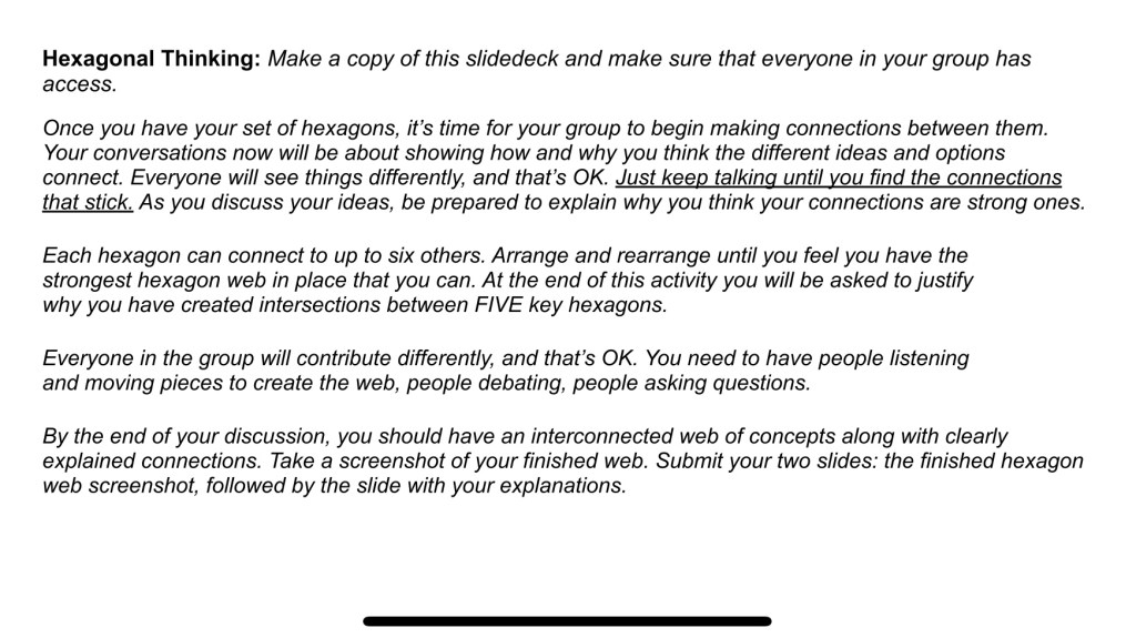 In google docs I created an interactive slide deck for students including instructions which you can download here. The engagement level was high as groups of students moved the hexagonal tiles around the screen while explaining their reasons for the decision. Some hexagons stayed in their original place, while some moved multiple times as students dove deeper, trying to find the ‘best’ connections and placement.