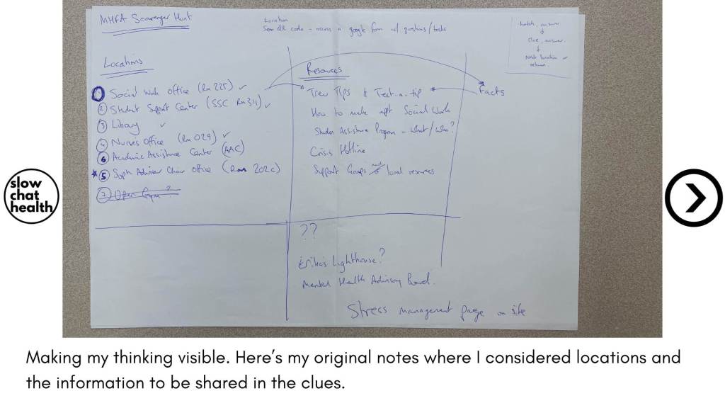 - For my recent mental health scavenger hunt, I chose locations that provide support to students: Social Work office, School Nurse, Academic Assistance Center, Library, etc. These locations should be accessible and safe for students to visit. (I had to move my Social Work clue away from the office door to protect student privacy).