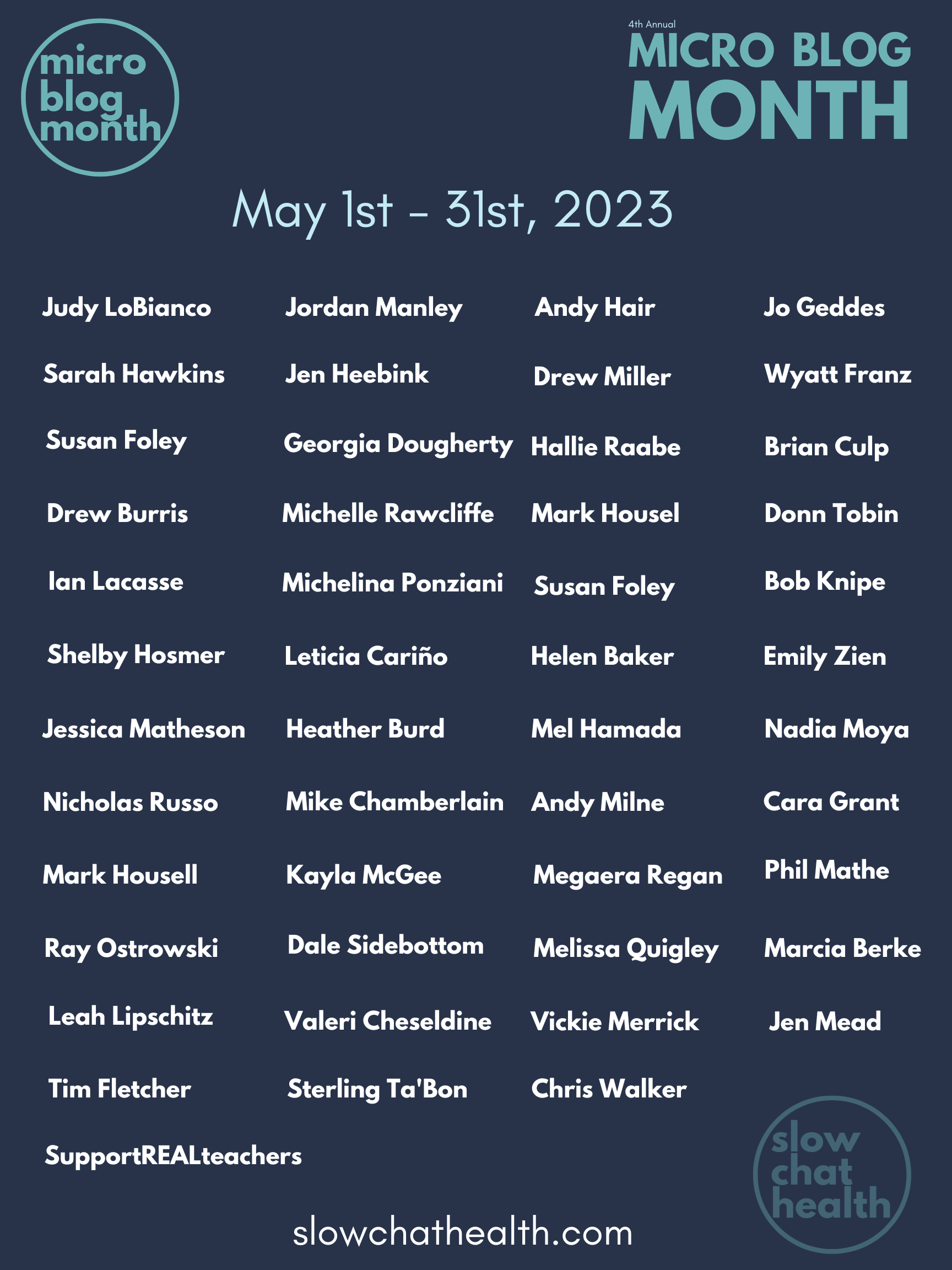 Please consider sharing your passion for health education with our global audience of like-minded educators. You can find examples of previous microblog posts here, and check out the names of our awesome contributors from 2023 below.