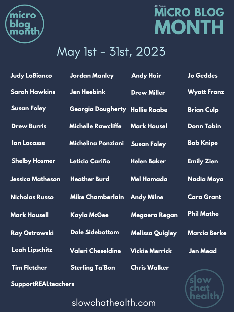 Launched in 2020, over 200 educators and authors have joined in with the last four #microblog events here on slowchathealth.com. All four have been a huge success, lasting a whole month and featuring voices from across the globe. Sharing bite-sized blog posts of approximately 500 words, there have been submissions from experienced bloggers, first-time writers, authors, teachers, and some students eager to share their passion for health and physical education. Looking to build on the popularity of the past four years, I announce that this May will again be Micro Blog Month, and I encourage you to join in with the fun.