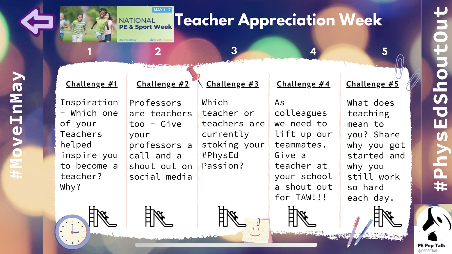 Just liked the themed events at many schools, inspirational educator Dr. Bob Knipe has put together a series of themed challenges for you to complete this week. Don’t forget to use the hashtag #PhysEdShoutout