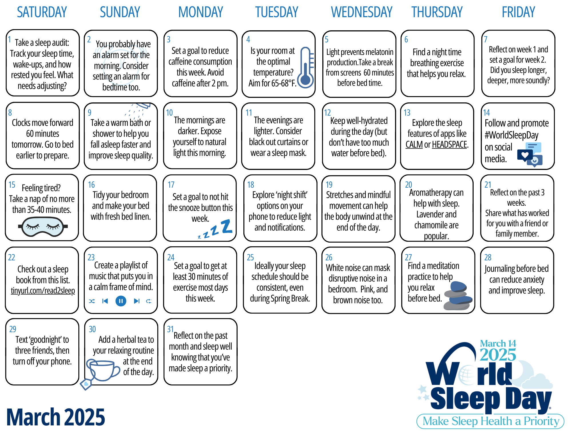 Spreading awareness encourages a community focus on sleep health. This educational action reinforces the importance of prioritizing sleep for overall well-being. Share your story online, engage with sleep content creators, boost sleep advocacy efforts, and even share this blog/calendar with others. - Feeling tired? Take a nap of no more than 35-40 minutes.