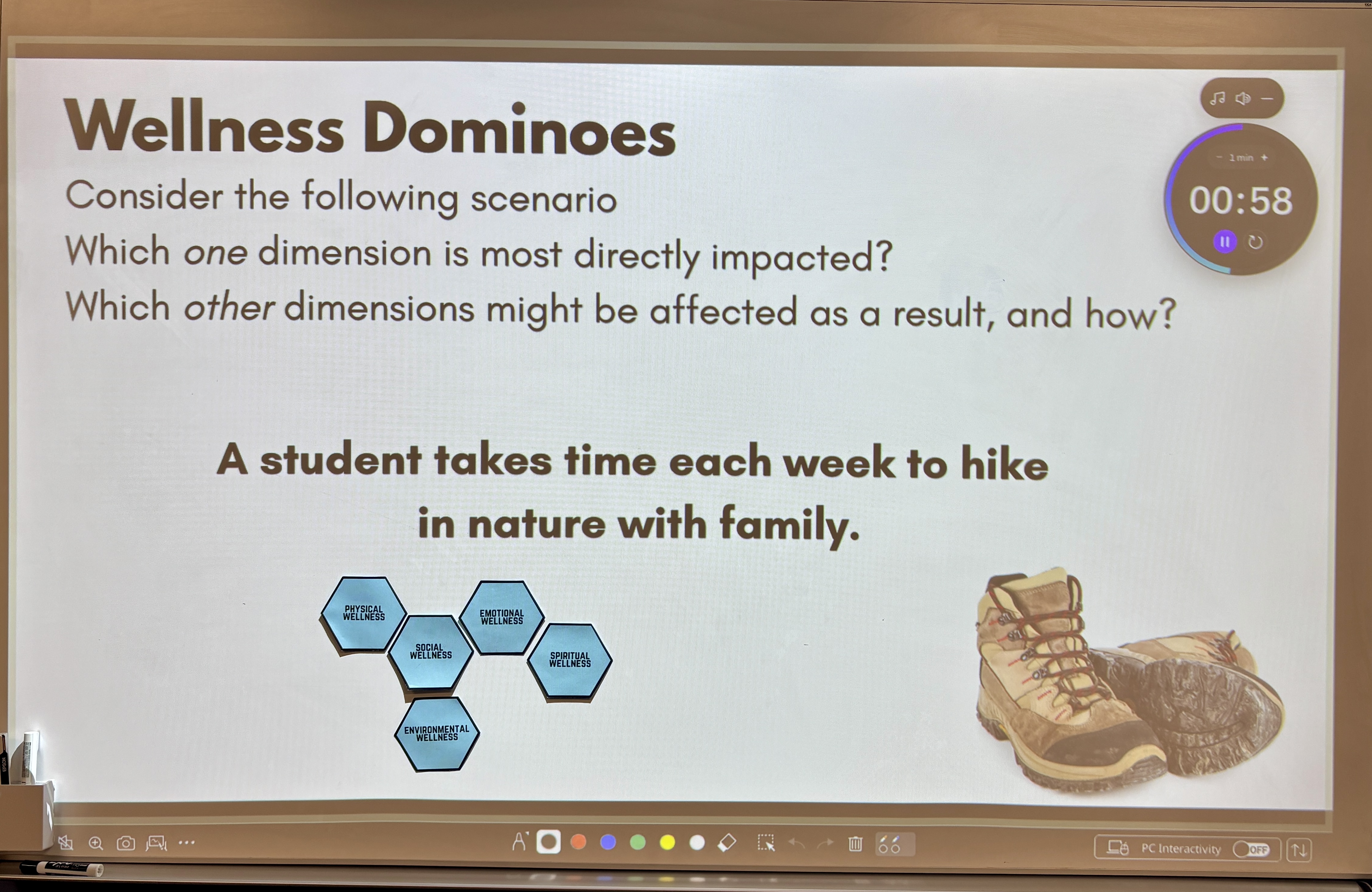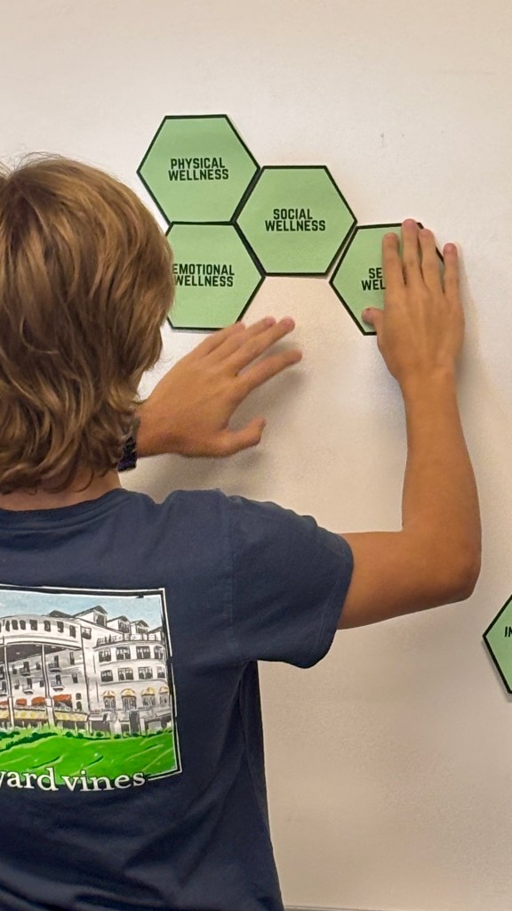 Most students will immediately spot the hit to physical wellness, a lack of sleep, fatigue, and lower energy. But then if I ask “what’s next?”, they quickly recognize that poor sleep impacts emotional wellness (irritability, stress), intellectual wellness (trouble retaining and recalling information), and even social wellness (tension with friends or less energy to socialize). By framing it as a chain reaction, students are nudged to think in layers, rather than stopping at the most obvious answer.
