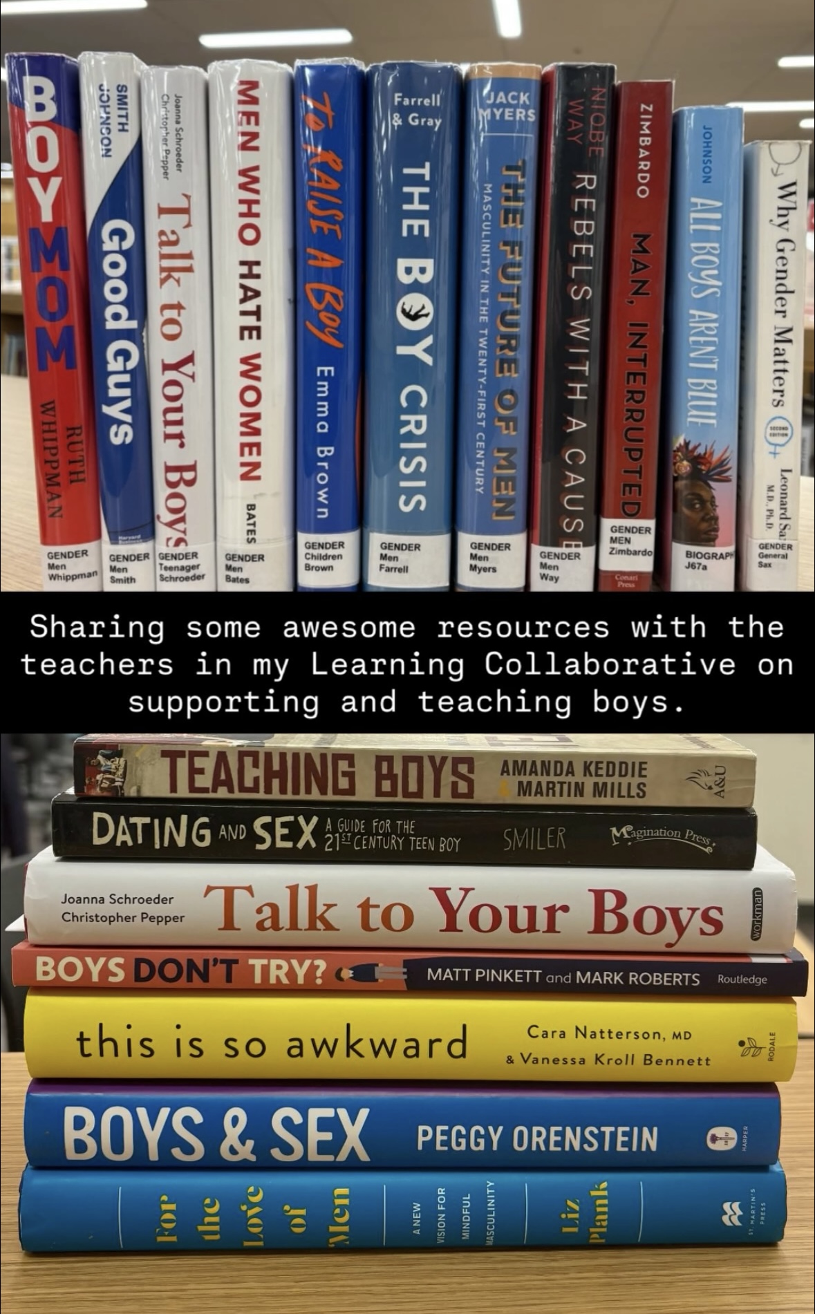 This blog post reminds me of this photograph I shared on Instagram last week. I asked my school library to pull some books for a group of teachers attending a professional development I was leading. Along with books from my own collection, here are their titles: